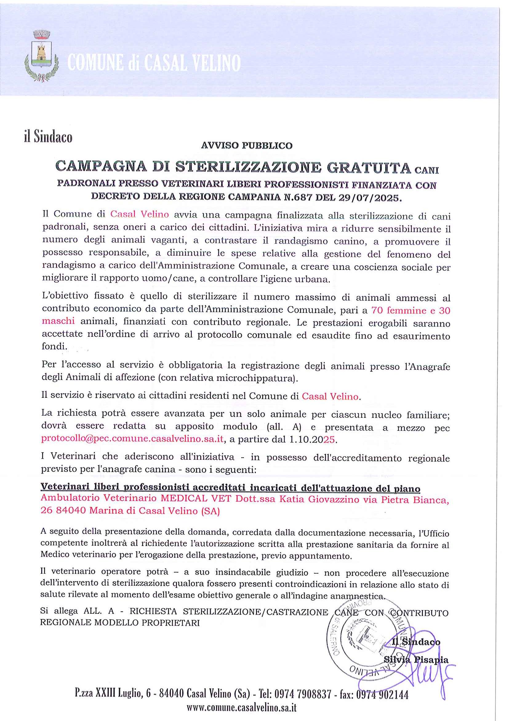Testo completo title Campagna di sterilizzazione gratuita cani padronali presso veterinari liberi professionisti finanziata con decreto della regione Campania n.687 del 29/07/2025.
